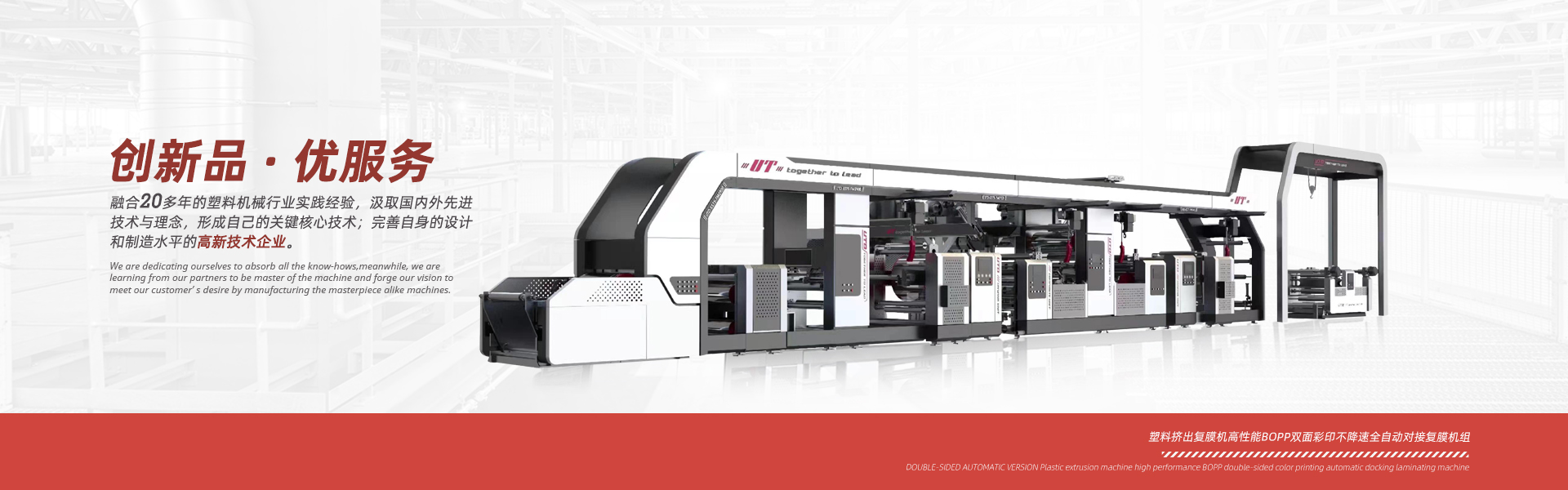 優(yōu)特機(jī)械精心致力于塑料編織行業(yè)、紙塑軟包裝行業(yè)、輪胎制造行業(yè)等成套生產(chǎn)設(shè)備的設(shè)計(jì)和制造,并為用戶提供生產(chǎn)工藝及培訓(xùn)。我們的服務(wù)范圍包括各類塑料覆膜機(jī)、紙張覆膜機(jī)、BOPP彩印膜雙面自動(dòng)對版覆膜機(jī)、 紙塑邊縫三合一覆膜機(jī)、中縫印刷制袋機(jī)、以及輪胎行業(yè)循環(huán)回收使用的隔離膜生產(chǎn)線。